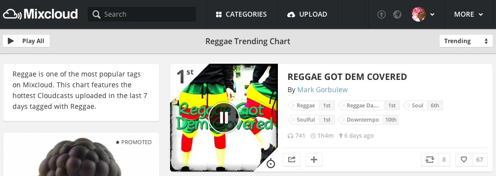 Posted on November 27, 2014December 4, 2014 by Mark Gorbulew “Reggae Got Dem Covered” reaches #1 on the Mixcloud REGGAE DANCEHALL, REGGAE, and SOULFUL Charts! Listen here- Share this: Click to share on X (Opens in new window) X Click to share on Facebook (Opens in new window) Facebook Click to share on LinkedIn (Opens in new window) LinkedIn Click to email a link to a friend (Opens in new window) Email More Click to print (Opens in new window) Print Click to share on Tumblr (Opens in new window) Tumblr Click to share on Reddit (Opens in new window) Reddit Like Loading... Related